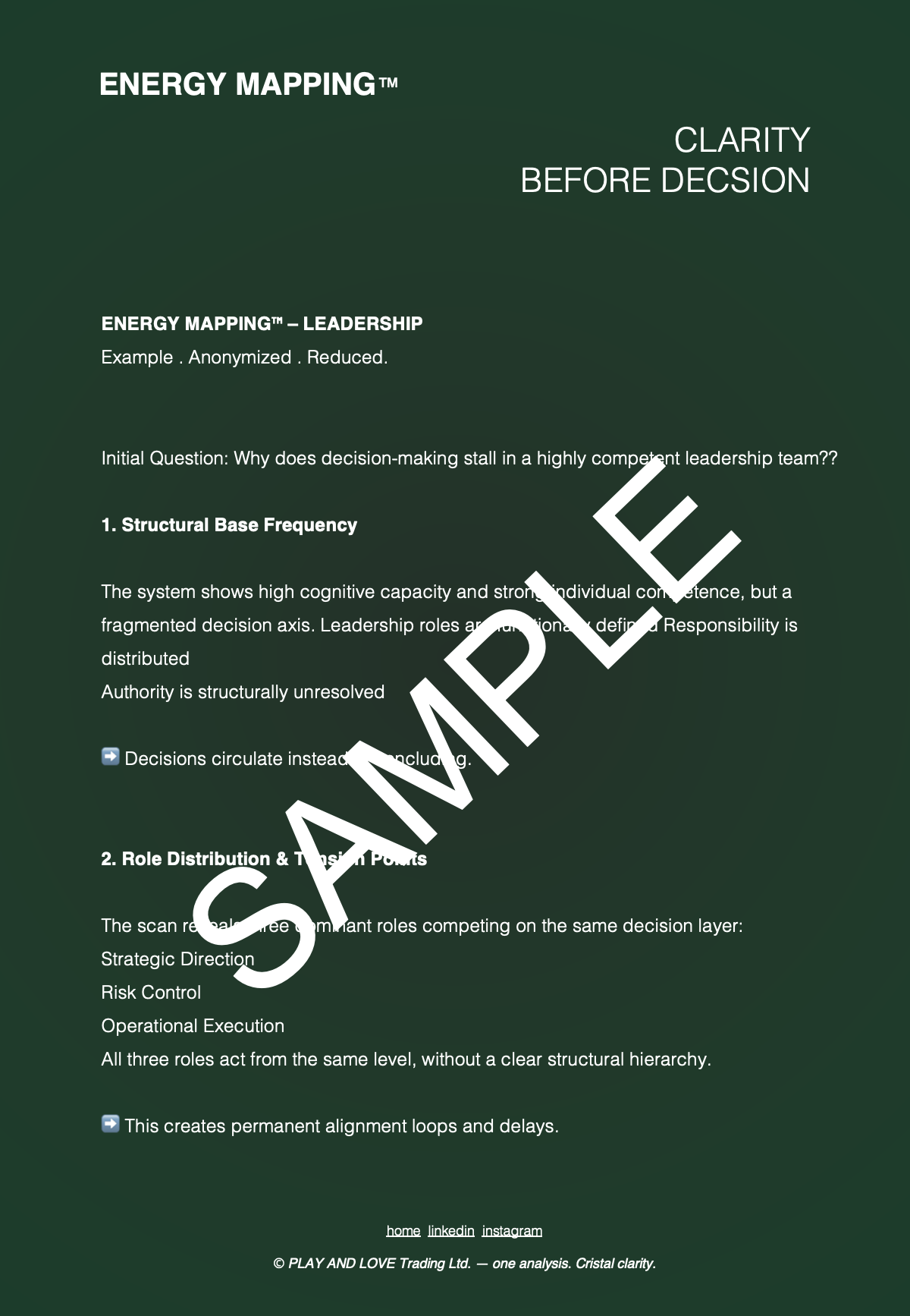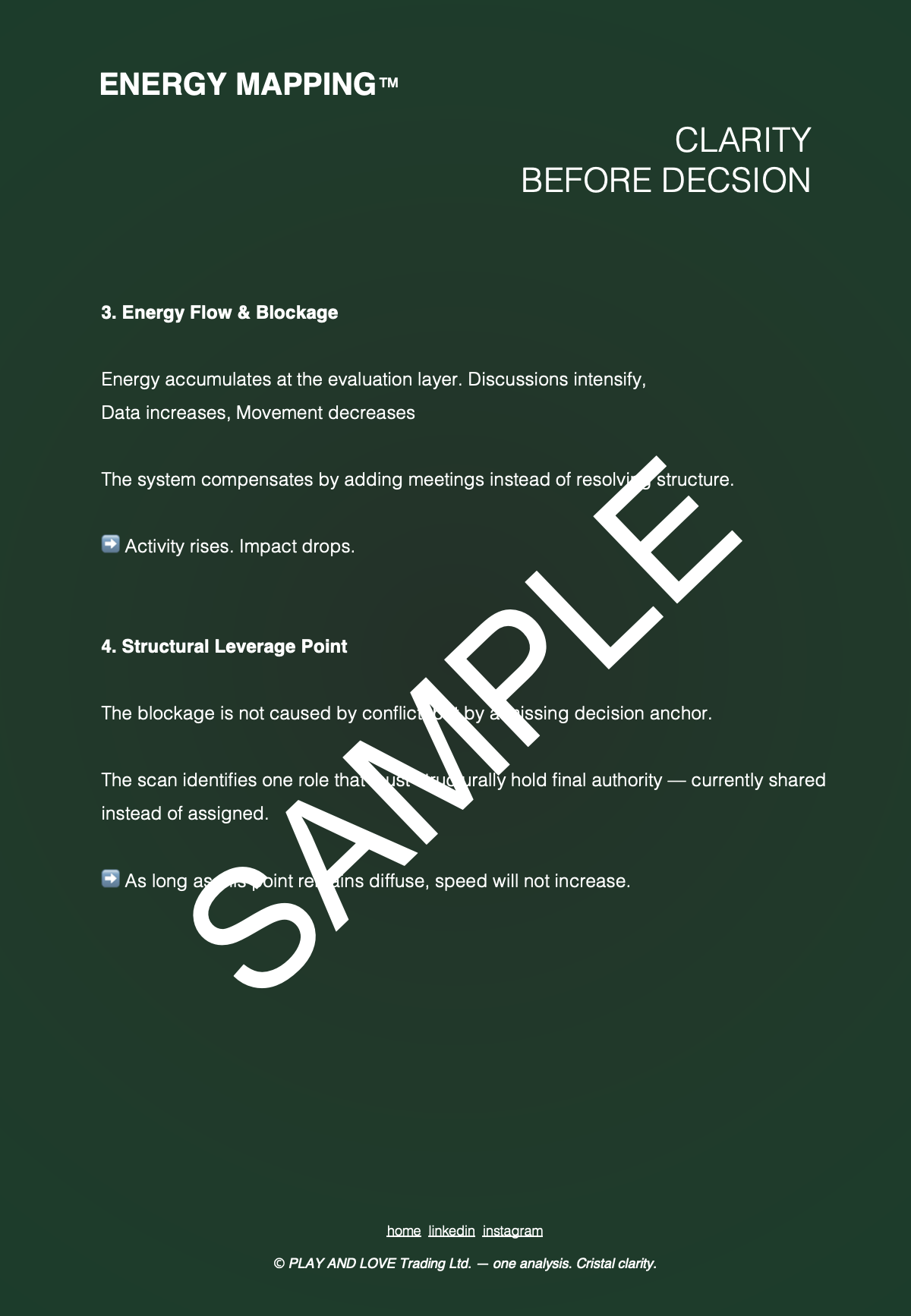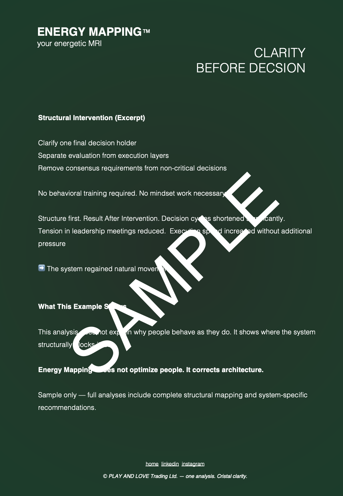 Energy Mapping™ does not evaluate people, motives, or attitudes. It shows exclusively how the system is built — and what this structure enables or prevents. Structure works. Always.
